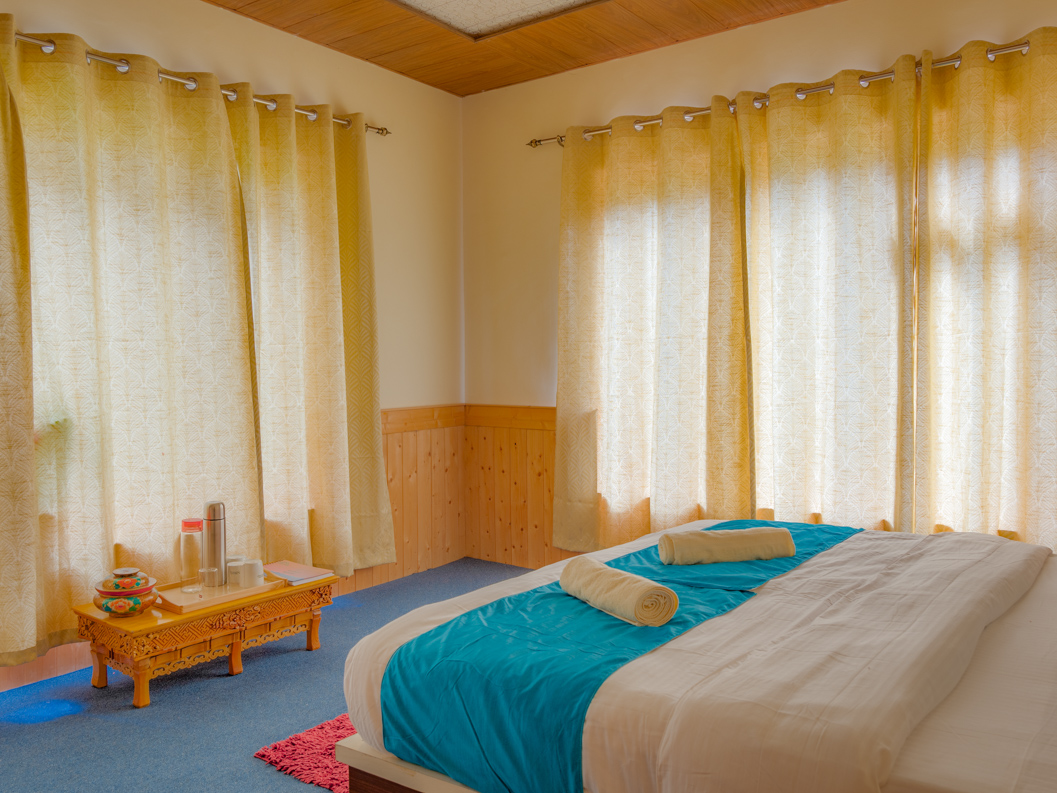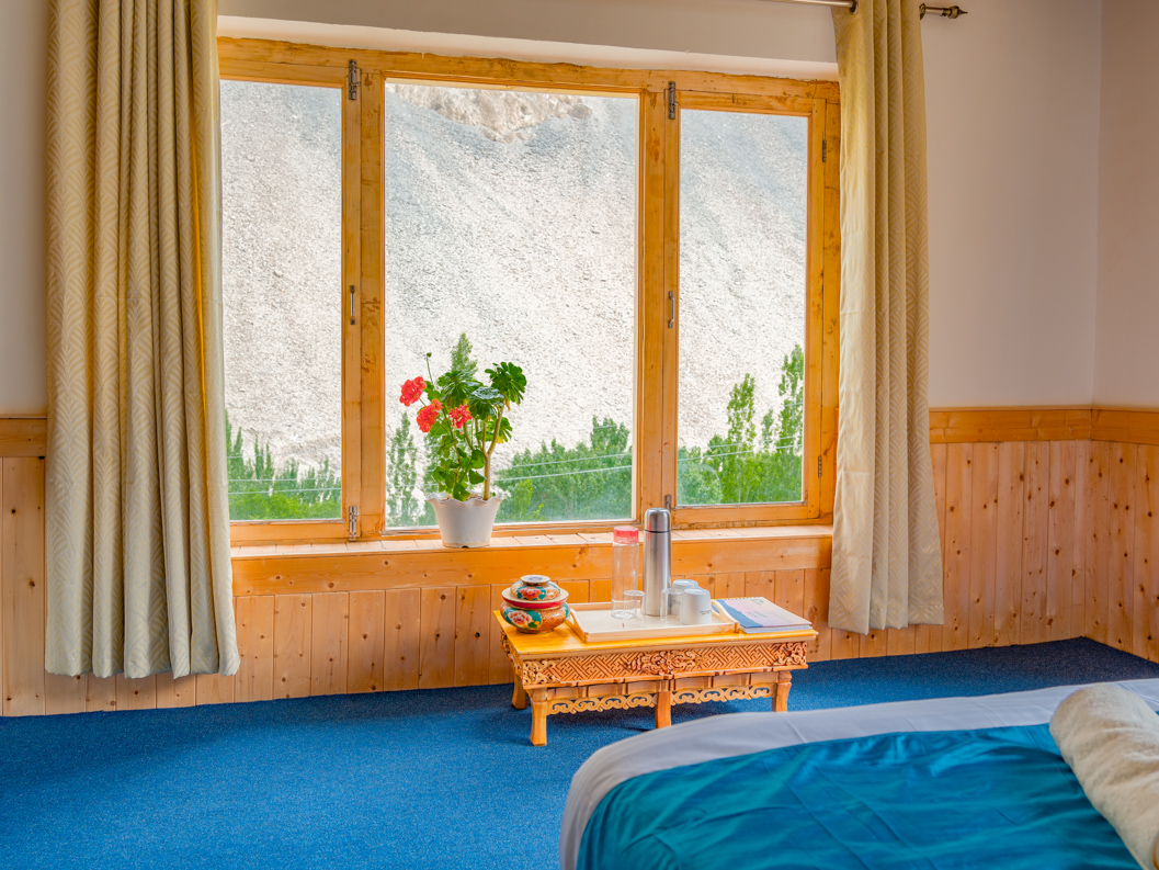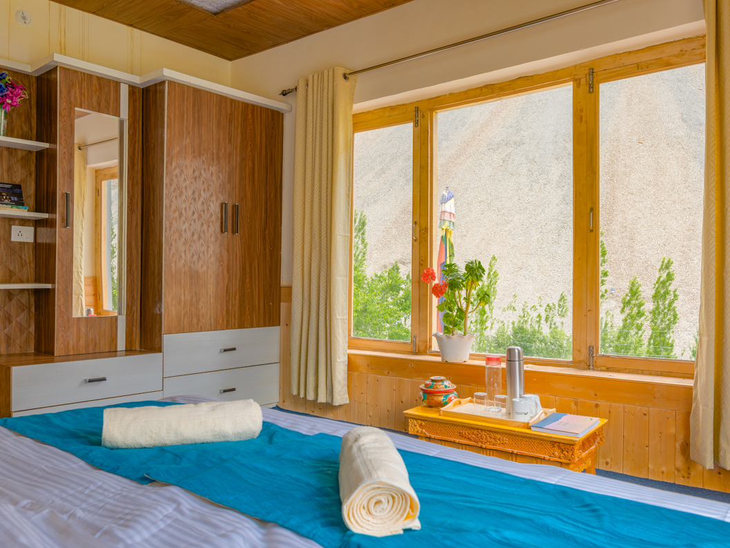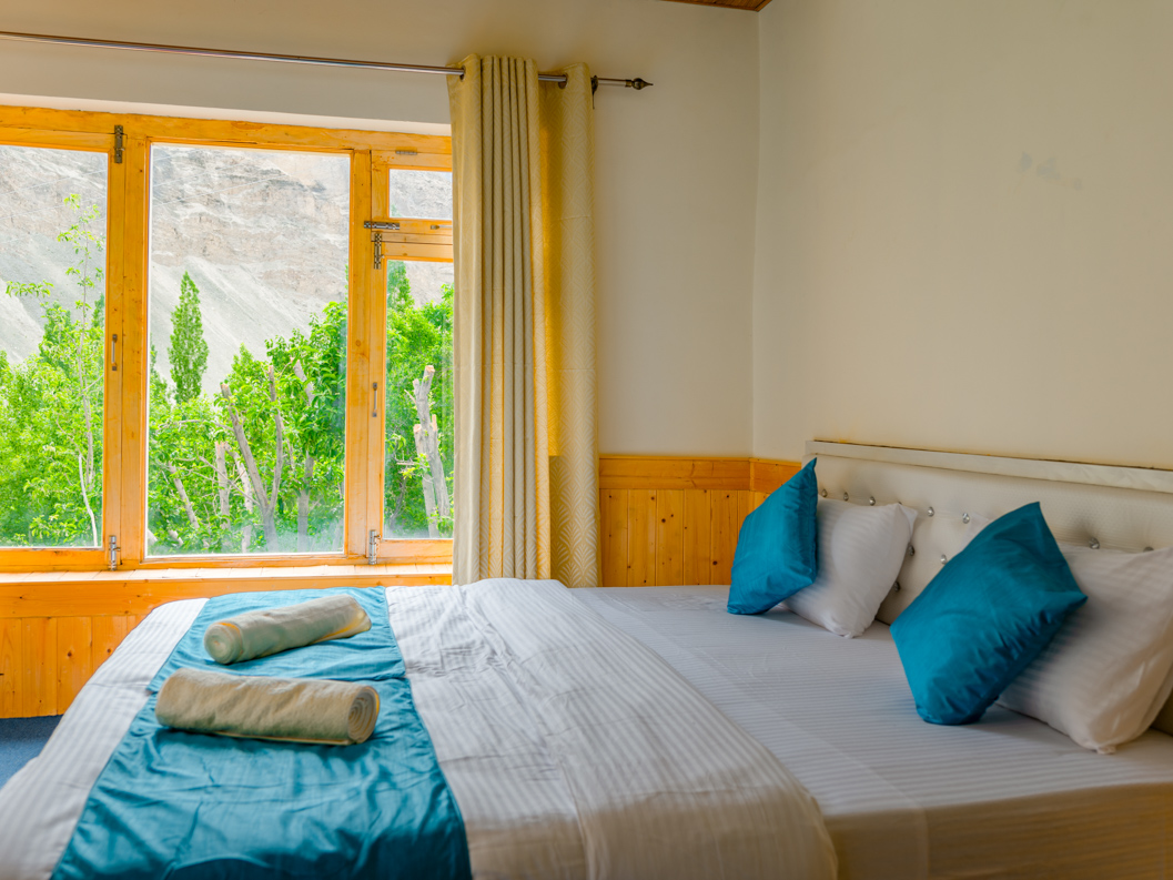 Das Homestay bietet ein komfortables Schlafzimmer im Haus, angepasst an die Bedürfnisse der Gäste. Der Raum ist einfach, sauber und gemütlich, mit handgefertigter Bettwäsche, die sowohl den Standards der Gastfreundschaft entspricht als auch einen traditionellen Charme bewahrt. Gäste erhalten warme Decken und alle wichtigen Annehmlichkeiten, um in jeder Jahreszeit Komfort zu genießen. Die Badezimmer sind im Sommer mit westlichen Toiletten ausgestattet, im Winter mit umweltfreundlichen Trockentoiletten. Warmwasser wird über Solarenergie bereitgestellt. Aus den Fenstern eröffnet sich ein atemberaubender Blick auf die Bergkette des Sham Valley und die umliegenden Aprikosenhaine.