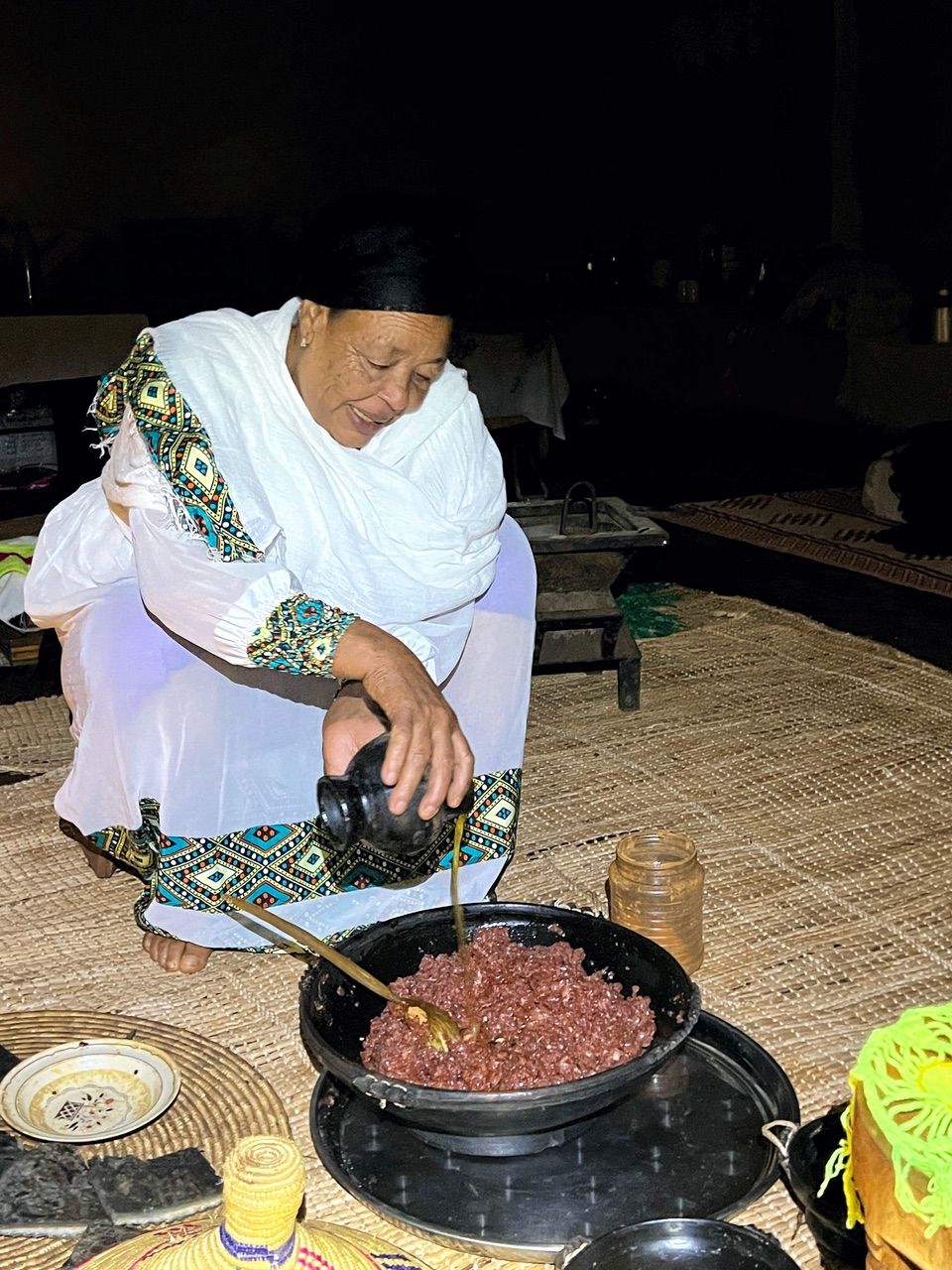 Die Tour führt durch eine üppig grüne Landschaft, die von False-Banana-Pflanzen (Enset) geprägt ist. Dabei triffst du Einheimische und erlebst ihre bekannte Gastfreundschaft. Außerdem hast du die Möglichkeit, lokale Spezialitäten zu probieren – darunter Kitfo (Gurage-Style Steak Tartare), Gomen Kitfo (gewürzter, gehackter Grünkohl) und lokalen Araki.