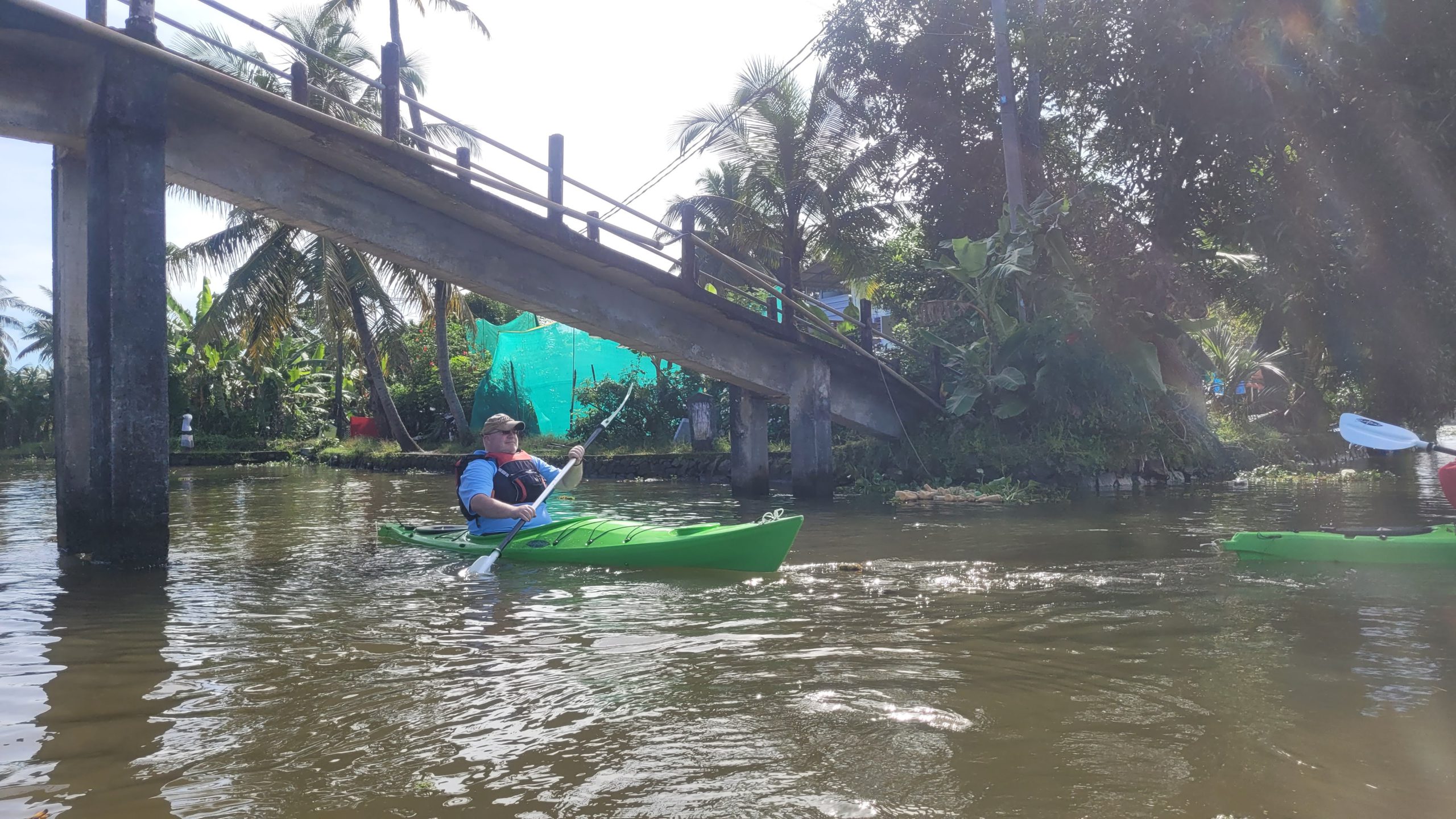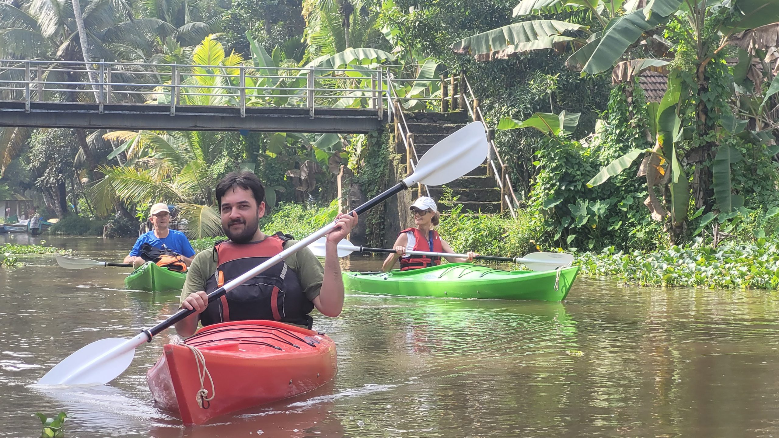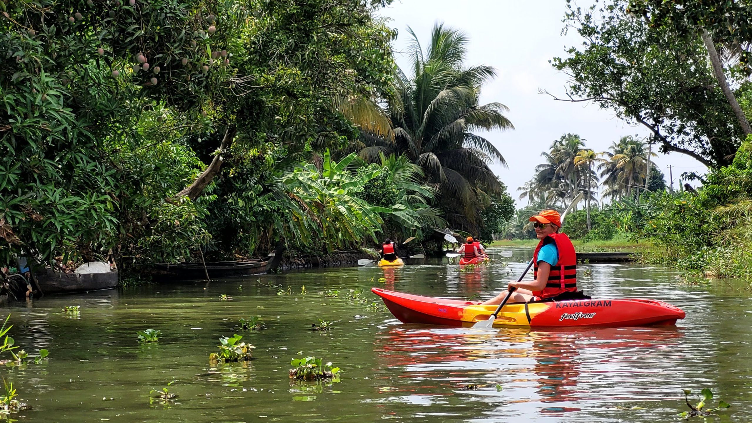 Das Abenteuer beginnt mit einer entspannten Kajakfahrt durch enge Kanäle, die sich durch kleine Backwater-Dörfer schlängeln. Überhängende Kokospalmen und dichtes Grün bilden dabei natürliche Tunnel, die dein Paddelerlebnis in sanftes Licht tauchen und für eine besondere Ruhe sorgen. Unterwegs kannst du den Dorfbewohnern bei ihren täglichen Routinen zuschauen und so wertvolle Einblicke in ihre Gemeinschaften, ihre alten Traditionen und ihr harmonisches Leben mit dem Wasser gewinnen.