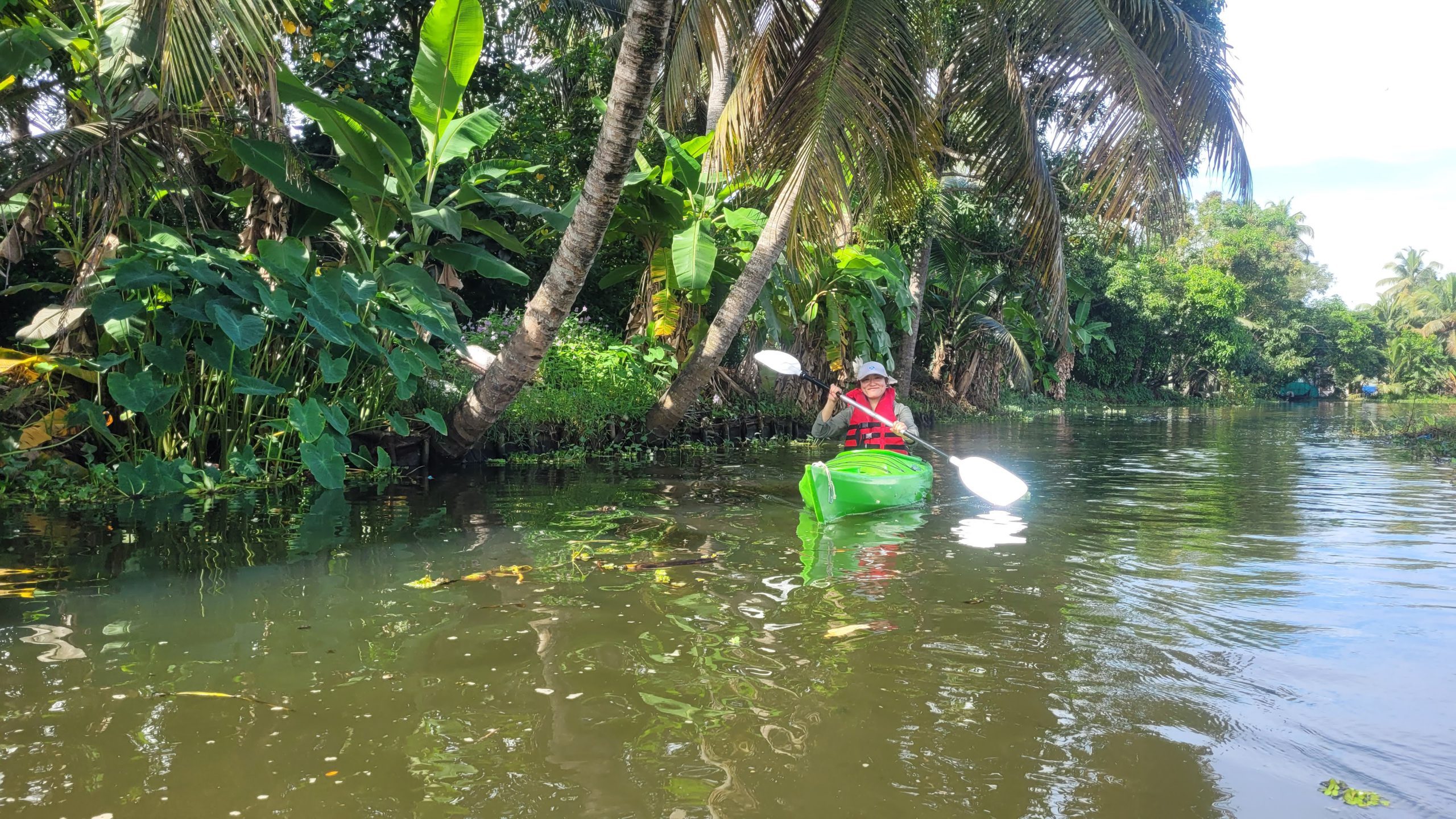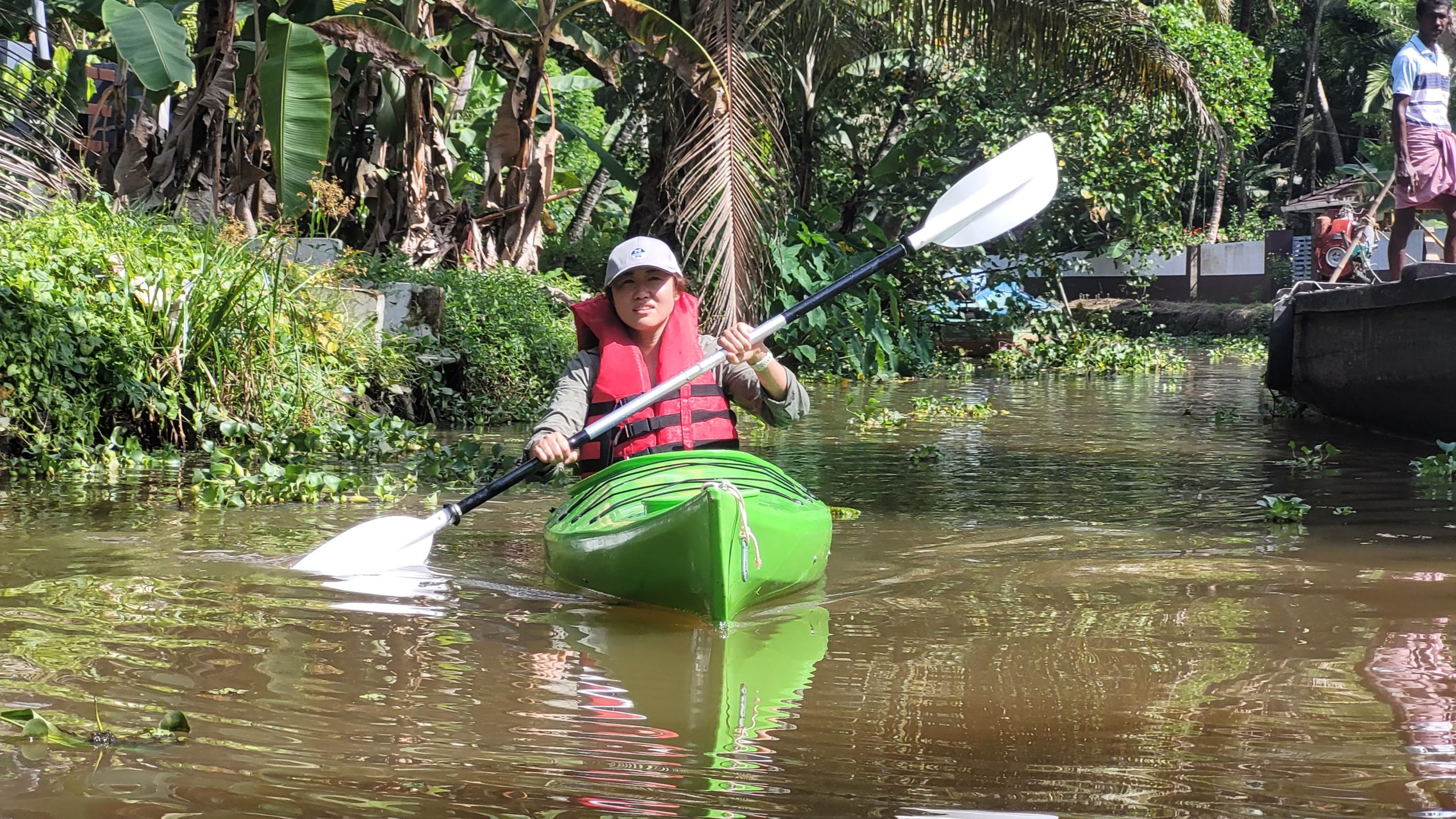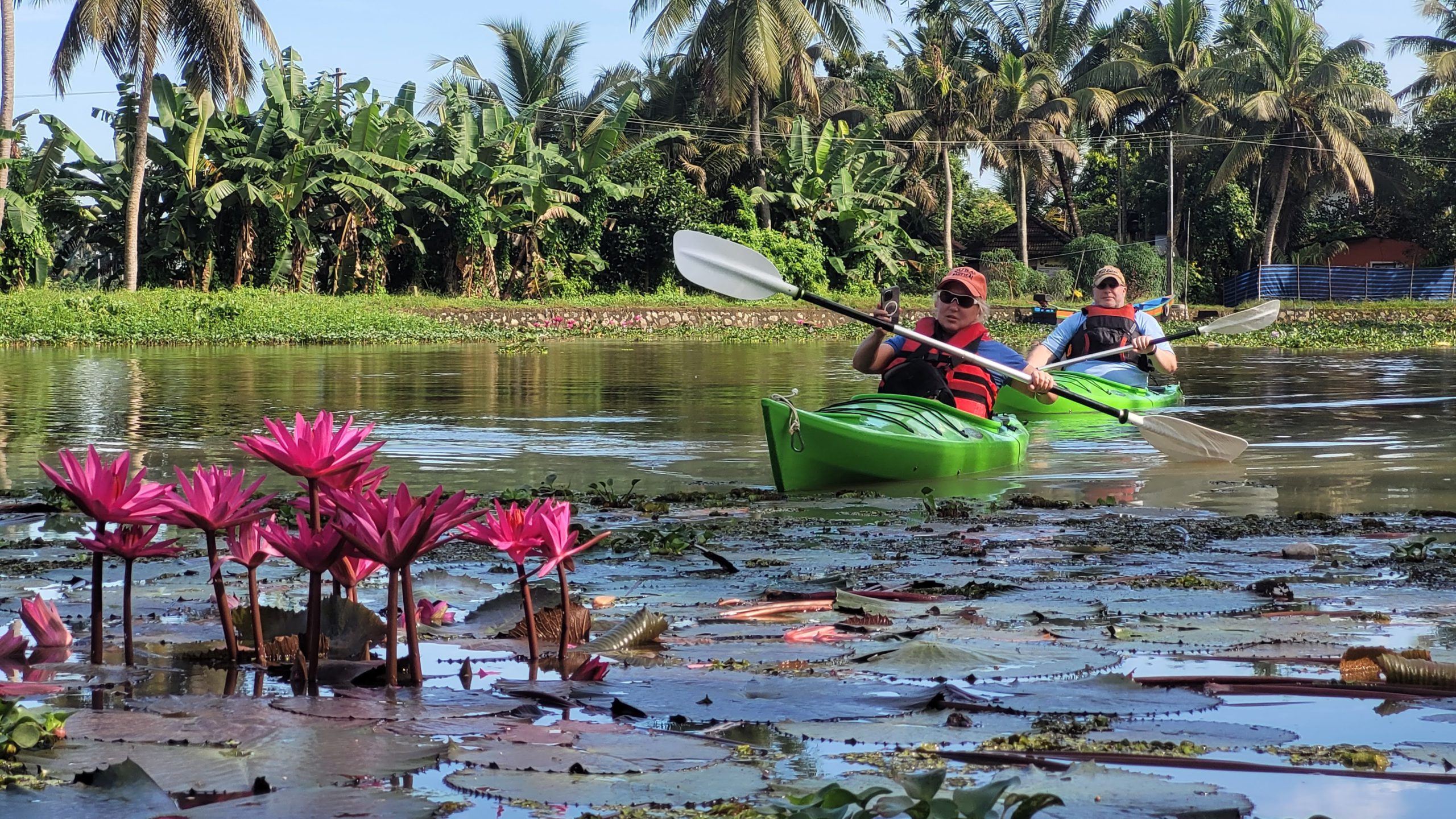 Das Abenteuer beginnt mit einer entspannten Kajakfahrt durch enge Kanäle, die sich durch kleine Backwater-Dörfer schlängeln. Überhängende Kokospalmen und dichtes Grün bilden dabei natürliche Tunnel, die dein Paddelerlebnis in sanftes Licht tauchen und für eine besondere Ruhe sorgen. Unterwegs kannst du den Dorfbewohnern bei ihren täglichen Routinen zuschauen und so wertvolle Einblicke in ihre Gemeinschaften, ihre alten Traditionen und ihr harmonisches Leben mit dem Wasser gewinnen.